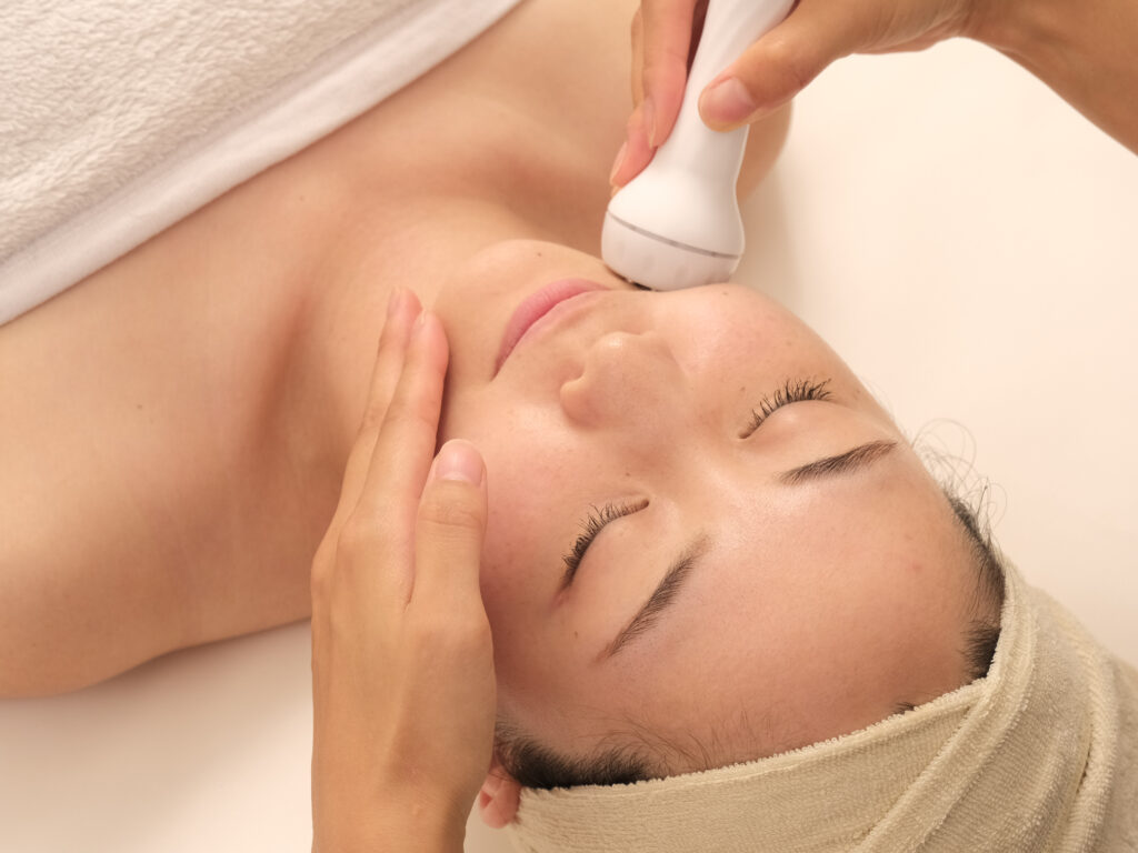 スチーマー蒸気→クレンジング→洗顔→ラジオ波→小顔リンパマッサージ(首、肩、肩甲骨含む)→炭酸パック→お仕上げ
